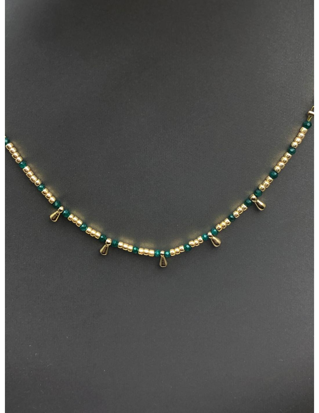 Cadenas mujer finas, con bonitas piedras verde botella, amatista, blancos y lágrimas doradas, una gargantilla sencilla para poner sola o junto a otras a varias alturas. Medidas: largo 45cm con prolongacion Materiales: bisutería con con cristales y circonitas y acero chapado oro